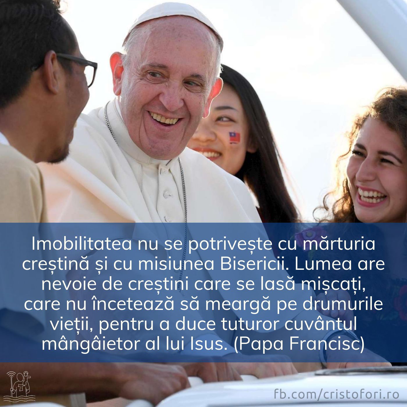 Papa FranciscImobilitatea nu se potrivește cu mărturia creștină și cu misiunea Bisericii. Lumea are nevoie de creștini care se lasă mișcați, care nu încetează să meargă pe drumurile vieții, pentru a duce tuturor cuvântul mângâietor al lui Isus.